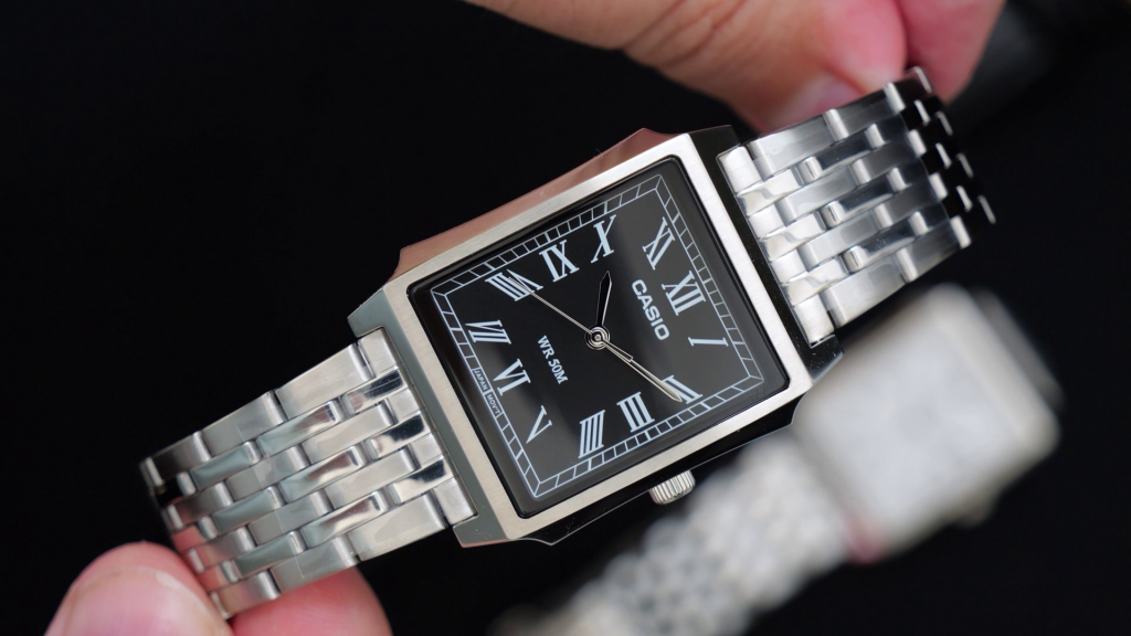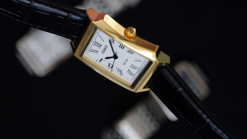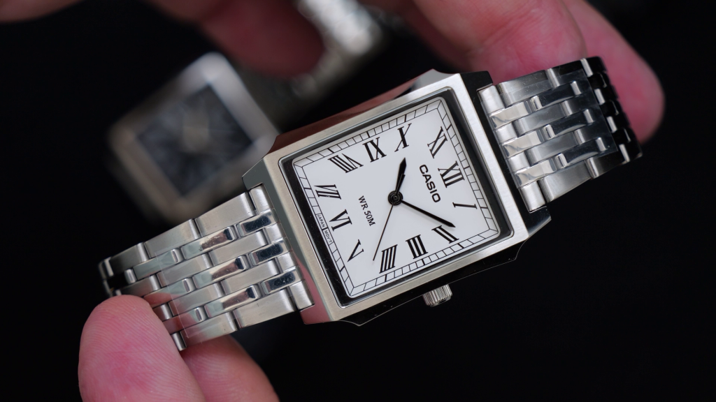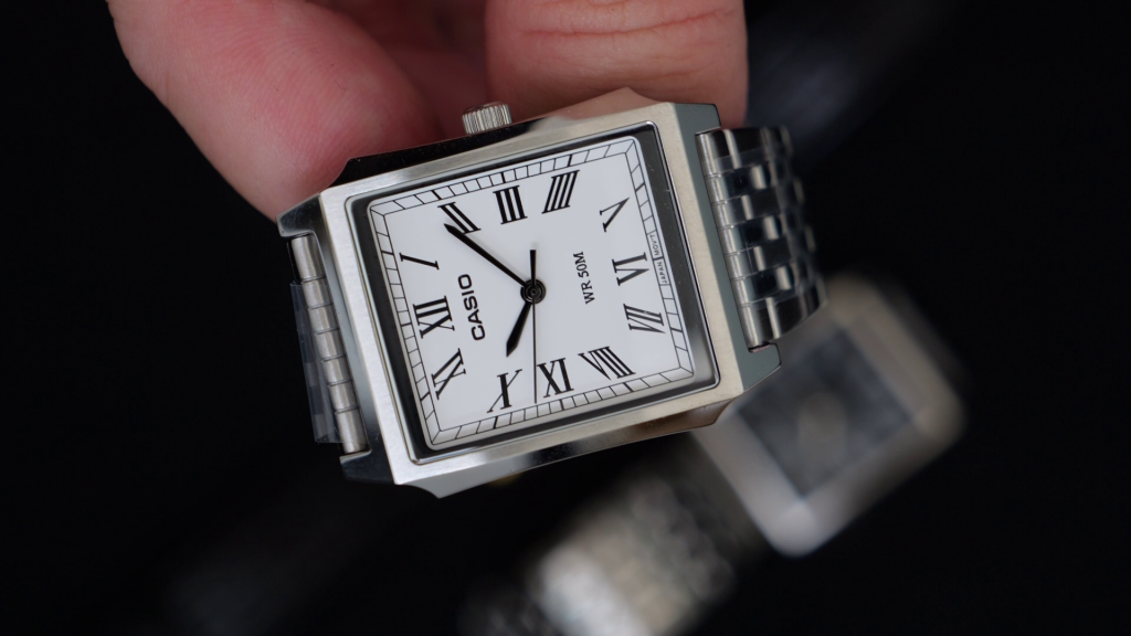 Amire elsőre megdöbbentett amikor kibontottam az egyébként standard Casio MTP családra jellemző csomagolást és szembejött a fehér számlapos változat az a tagadhatatlan hasonlóság – nem túlzás talán az összekacsintás kifejezést sem használni – a már említett ikonikus, úgynevezett első karórával. Nyilván tagadhatatlan a hasonlóság, és igazából igazi különbség csak a fémszíjban, a kékített mutatók hiányában, illetve a tok két oldalán ebben a homorúan ívelt vonalvezetésében fedezhető fel.